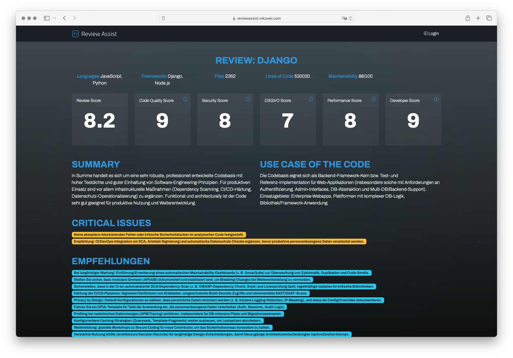 Unsere Experten führen eine manuelle Tiefenanalyse durch oder setzen unser Tool ReviewAssist für ein automatisiertes Audit ein. Dabei betrachten wir Architektur, Security, Performance und Best Practices nach etablierten Standards wie ISO 25010 und OWASP.